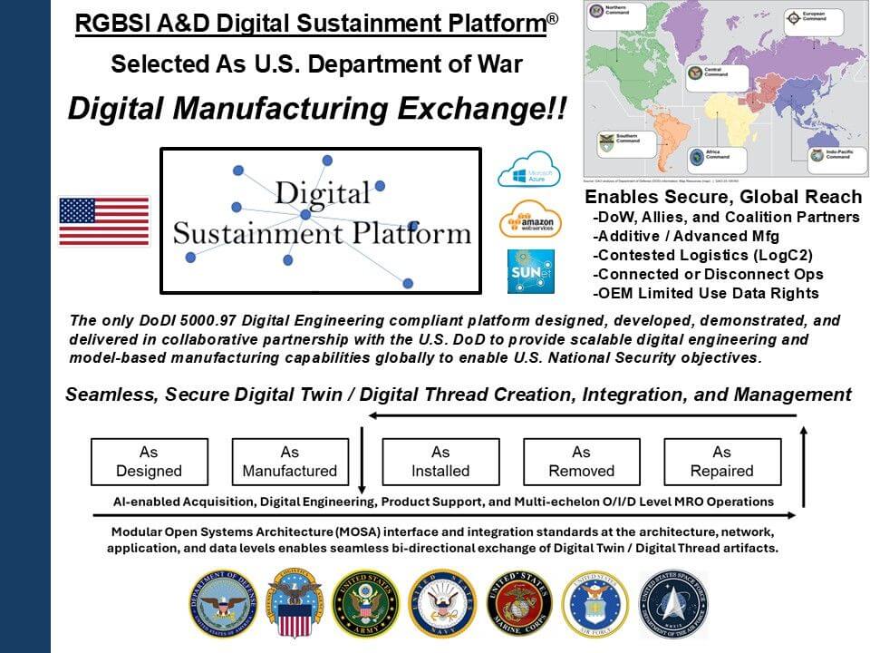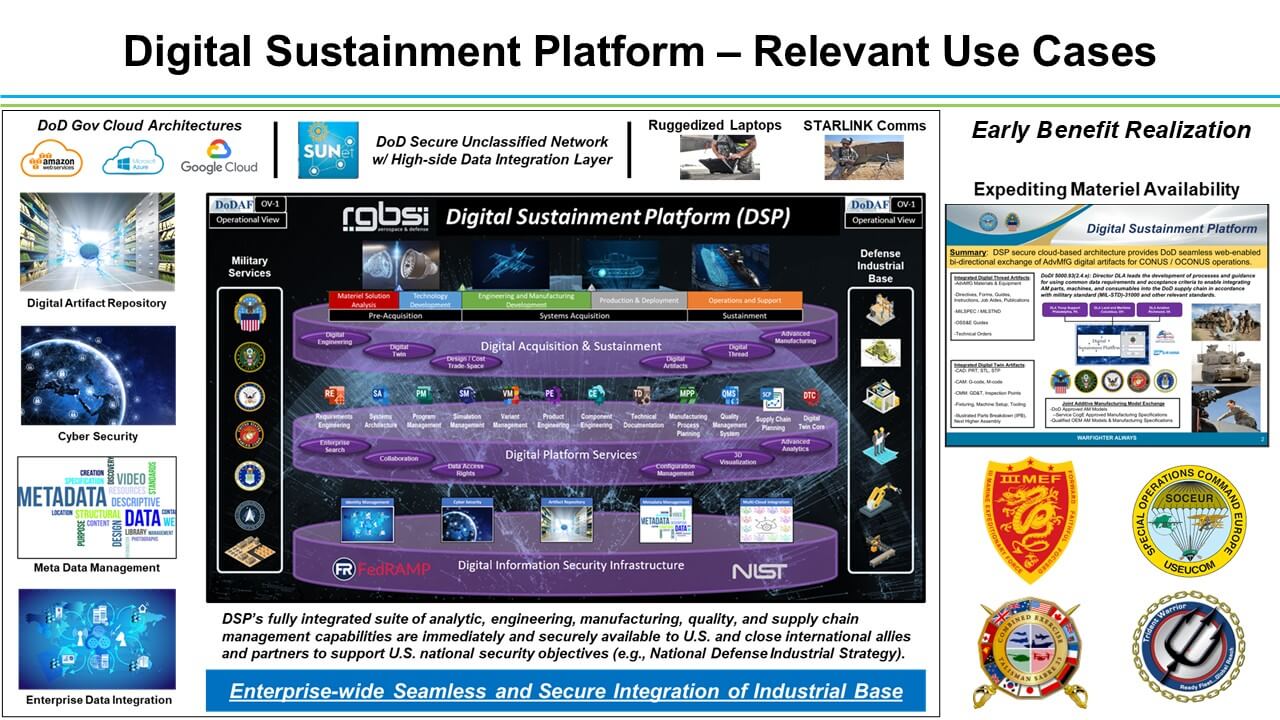 The Digital Sustainment Platform (DSP) provides cloud-based industry best practice advanced analytics, engineering, manufacturing, modeling & simulation, product quality, and supply chain management service-based capabilities for the Department of War (DoW), Defense Logistics Agency (DLA), and DoD Arsenals, Depots, and Shipyards, and extends these same capabilities via a Service Portfolio Management (SPM) strategy to Original Equipment Manufacturers (OEM) and Small-to-Medium Manufacturers (SMM) ensuring availability of standards-based approaches for achieving DoW digital engineering, model-based engineering, model-based manufacturing, and model-based sustainment objectives. The DSP's fully integrated SPM strategy provides opportunities to assess, evaluate, and modify service-based capabilities (e.g., engineering Computer Aided Design (CAD) applications) to make sure the proper mix of applications, tools, and services are made available to DoW, DLA, OEM, and SMM analytical, functional, and technical members of the DoW organic and wider U.S. defense manufacturing industrial base enterprise.