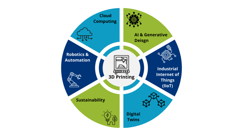 In Industry 4.0/5.0 environments, 3D printing integrates with cloud computing, artificial intelligence, digital twins, and the Industrial Internet of Things. These technologies enable real time monitoring, predictive maintenance, and distributed manufacturing.